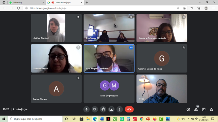 O encontro, via Google Meet, ocorreu das 10h às 12h10 e contou com a participação de 21 alunos do ensino médio e das professoras, Carmen Soares, Lisiane Tidra, Adriana Hipólito e do professor George Miranda. A Coordenadora Pedagógica, Tatiana Geraldino e a diretora da instituição, Marta Veiga Oliveira, também se fizeram presentes.
